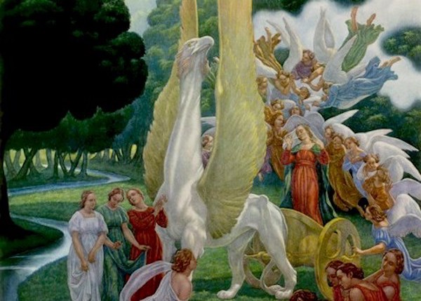 And then comes the revolutionary insight: as the pilgrim is looking at both the griffin and the reflection of it in Beatrice’s eyes, he notices that the real griffin in front of him is stable, but the image and reflection of it within his soul, is transforming. Thus we have a new overall image for the journey: a way of visualizing both God, and our perception of God within our Soul simultaneously, the latter growing and changing.